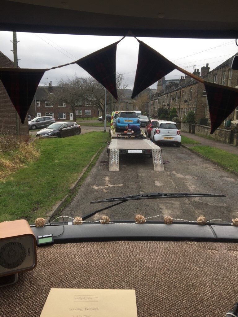 These issues were niggling me and, bored between Christmas and New Year I had a look at what might be possible re-build wise. I quickly found a company in Essex who would do magically everything needed fro a fixed price of £2500. All seemed well and the could collect it too. I did ring another more local firm and they didn’t want to do it. (Also I asked an Elland garage for a price and they agreed it would cost £1200-£1500 plus parts which I had to provide but this didn’t work for me). So Mike came to collect and we had reservations, and Sandra had kittens when she saw the tinny trailer Heidi went on and nearly stopped me but off she went and we thought we may never see her again. Mike said they were a good firm and I should look on YouTube about them. Mike sent pictures of her being dropped off. I Googled and YouTubed and didn’t find too much to worry about except a couple of recent bad reviews which were contested.